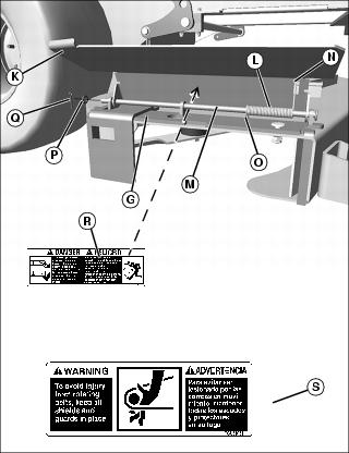 6. Install spring (L) on rod (M), with long end of spring through opening (N), and short end (O) placed under deflector plate onto deck, and place rod and spring through three tabs on support plate (G).
