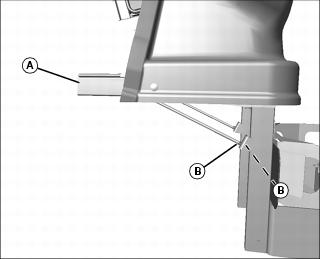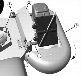 1. Raise deflector plate (A), and install rod end (B) of support frame in mounting bracket (C).