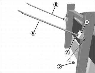 1. With locknut (A) installed on the end of rod (B), secure rod to bracket (C) on end of rear mounting bracket with second locknut (D). Repeat for opposite side (E).