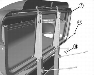 2. Install hopper (F) onto top of rear mounting bracket, and secure through holes with pin (G) and spring locking pin (H).