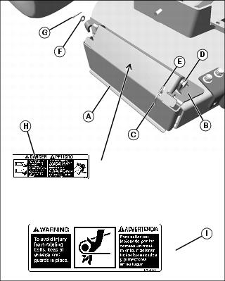 NOTE: Warning label (I) is already on deck but is partially obscured with new block off plate. Position new label over the partially exposed portion of the existing label.