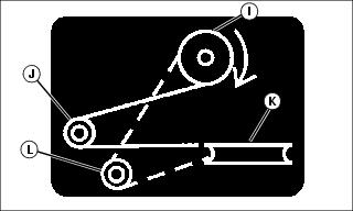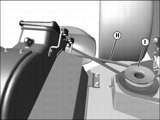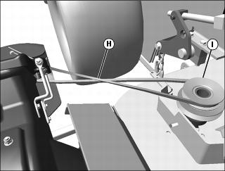 4. Install drive belt (H) to top sheave (I) with belt “V” in groove.