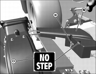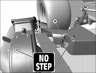 8. If not already installed, install “no step” label (O) onto top of belt shield.