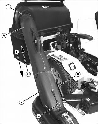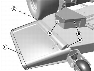2. Remove fastener (C) and rod (D), and remove mower discharge chute (E).