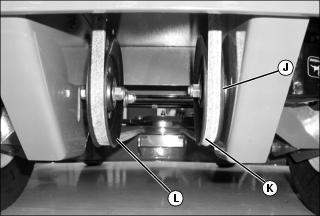 7. Adjust the discharge gate link (I) so that the discharge gate (K) is fully closed. Secure discharge gate link to discharge gate with the appropriate hardware and tighten the jam nut.