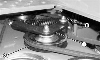 3. Check to make sure the belt tension spring (H) is installed properly between the idler arm weldment (F) and stud (I).