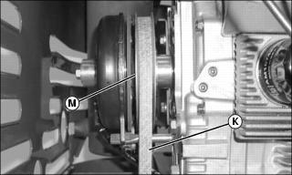 12. Remove mule drive belt (K) from the PTO clutch sheave (M).