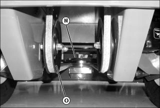 13. Remove mule drive belt from idler pulley (O) and jackshaft assembly sheave (N).