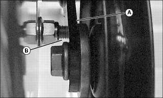 1. Check the mule drive idler arm (A) to see if it is contacting the bolt (B). If there is contact, adjust the mule drive belt tension.