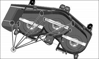 6. Clean underside of mower deck, particularly in critical areas (B).