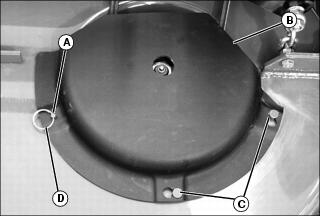4. Remove belt shields (B) by lifting corner of belt shield from drilled stud (C). Rotate shield counterclockwise to clear head pins (D).