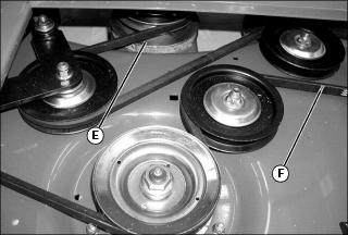 · Remove deck drive belt from upper jackshaft assembly sheave (F), spindle sheaves and idler pulleys.