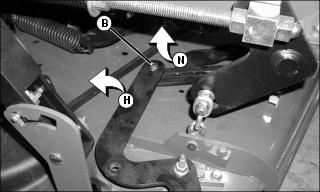 4. Loosen the slider bushing bolt (B). Adjust the right inner baffle arm (N) until it makes contact with its stop point. Adjust the right outer baffle arm (H) until the right outer baffle makes contact with the right inner baffle. Tighten the slider bushing bolt (B).