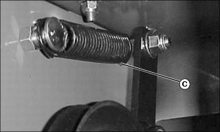 2. Check the extended length of the tensioning spring (C). If it is less than 16.6 cm (6-1/2 in.), adjust the mule drive belt tension.