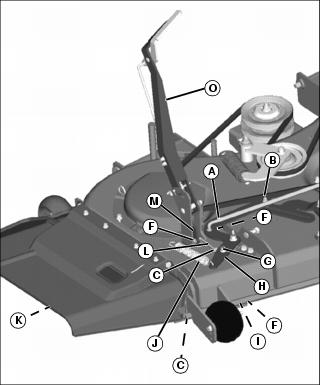 10. Move deck mode lever (O) into the mulch position Adjust handle link (L) so that the baffles and discharge gate are fully closed when the deck mode lever is latched into the rear most gate. Tighten the jam nuts on handle link (L).