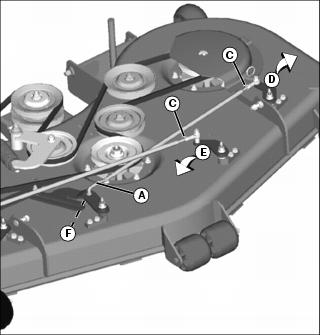 6. Loosen lift assist springs (D) on each side of machine to allow deck to sit flat.