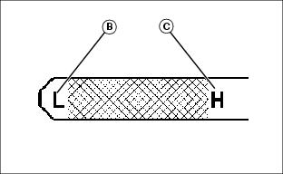 6. Remove dipstick and check oil level. Oil level should be between "low" (B) and "high" (C) marks on dipstick.