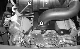 10. Clean area around the oil fill cap (D) and oil dipstick (E).
