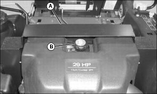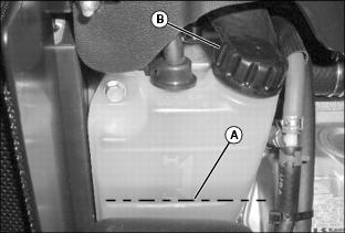 7. Remove cap (B) from recovery tank to add coolant if necessary.