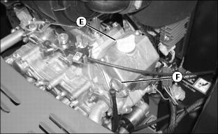 12. Clean area around the oil fill cap (E) and oil dipstick tube (F).