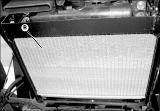 3. Remove two locking nuts (B) retaining the cover to the radiator support.