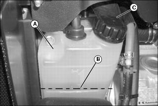 · Coolant level should be at the lower line (A) on the recovery tank when the engine is cold.