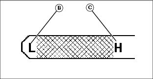 6. Remove dipstick and check oil level. Oil level should be between "low" (B) and "high" (C) marks on dipstick.