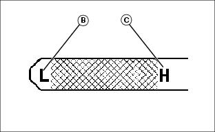 6. Remove dipstick and check oil level. Oil level should be between “low” (B) and “high” (C) marks on dipstick.