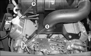10. Clean area around the oil fill cap (D) and oil dipstick (E).