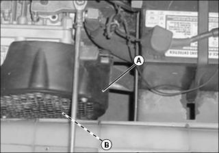 4. Visually check level of fluid. Fluid level should be even with the fill line (B) on the side of the tank.