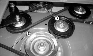 7. Remove mower deck belt (E) from upper jackshaft assembly sheave (F).
