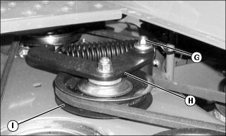 • Loosen cap screw (G) enough to allow the idler arm weldment (H) to be raised and the belt slid under idler sheave (I).