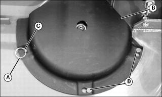 • Lift corner of belt shield from drilled stud (C). Rotate shield counterclockwise to clear head pins (D).