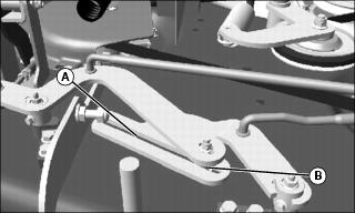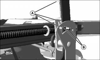 • Lubricate right hand linkage slot (A) and pivot (B) with John Deere Super Lube or similar dry lubricant spray.
