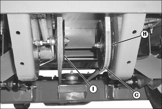 · Loosen cap screw (G) enough to allow the idler arm weldment (H) to be raised and the belt slid under idler sheave (I).