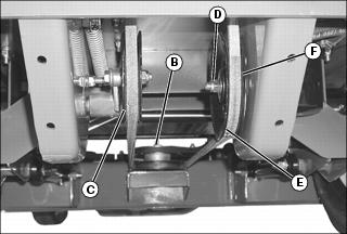 2. Loosen adjustment idler retaining bolt and nut (D). Slide to top of adjustment slot and snug bolt and nut to temporarily hold idler in place.