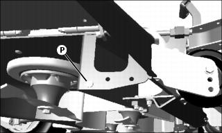 · With discharge gate in the mulch position (rear most gate) turn the right spindle to insure that the blade does not contact the gate (K). If the blade contacts the gate, move the washer, which is located under the M6 flange nut, to the position under the head of the M6 carriage bolt (P) and readjust the gate link. Verify that the blade clears the gate in this new position.