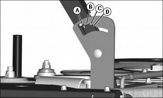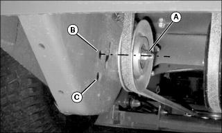 2. Check that the axis of the tensioner sheave bolt (A) is aligned between the upper (B) and lower (C) holes in the left mule plate. If it is at or below the lower hole, the belt requires adjusting.