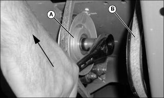 1. Use an 18 mm socket and ratchet wrench to raise the idler sheave (A) and release belt spring tension. Remove the mule drive belt from the fixed idler (B).