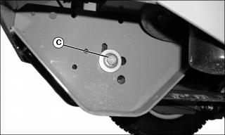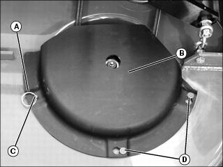 · Lift corner of belt shield from drilled stud (C). Rotate shield counterclockwise to clear head pins (D).