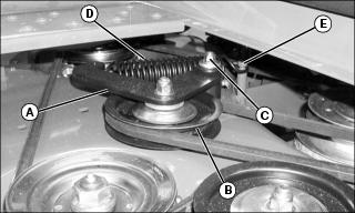 3. Check to make sure the belt tension spring (D) is installed properly between the idler arm weldment (A) and stud (E).