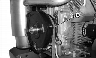 1. Raise the idler arm weldment (A) and slide the replacement belt under idler sheave (B).