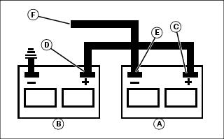4. Connect the other end (F) of negative (-) booster cable to a metal part of disabled machine frame away from battery.