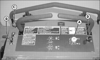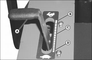 NOTE: In cold weather or with a new machine, it may be necessary to engage choke (B) at the same time as PTO knob (C) to prevent engine from stalling.