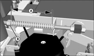 1. Adjust cap screws (B) (two on each side of deck) until deck is within 3 mm (1/8 in.) of level from side-to-side.