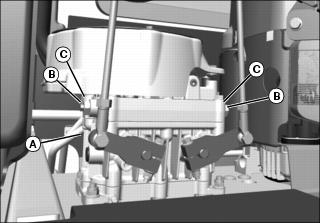 2. Loosen jamb nuts (outer nut) (C). Turn both pump free-wheel valves (B) counterclockwise approximately one full turn (open position).