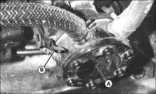 6. Remove oil filter (B) located on the lower left side of the engine. Turn filter counterclockwise to remove.