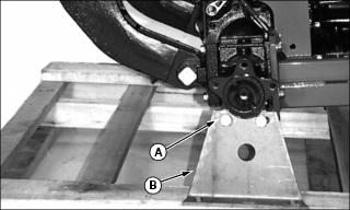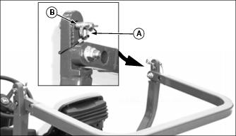 4. Install drilled pin (B) into holes on left and right side of ROPS, and secure in place with spring pins (A).