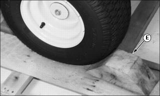 10. Using a pry bar and hammer, remove the wheel blocks (E) from behind the left and right side rear tires.