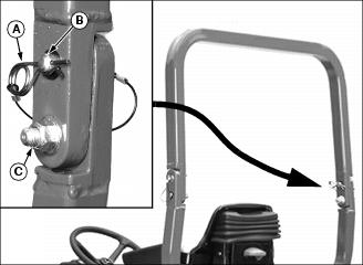 1. Remove spring pin (A) from drilled pin (B) on left and right side of ROPS.